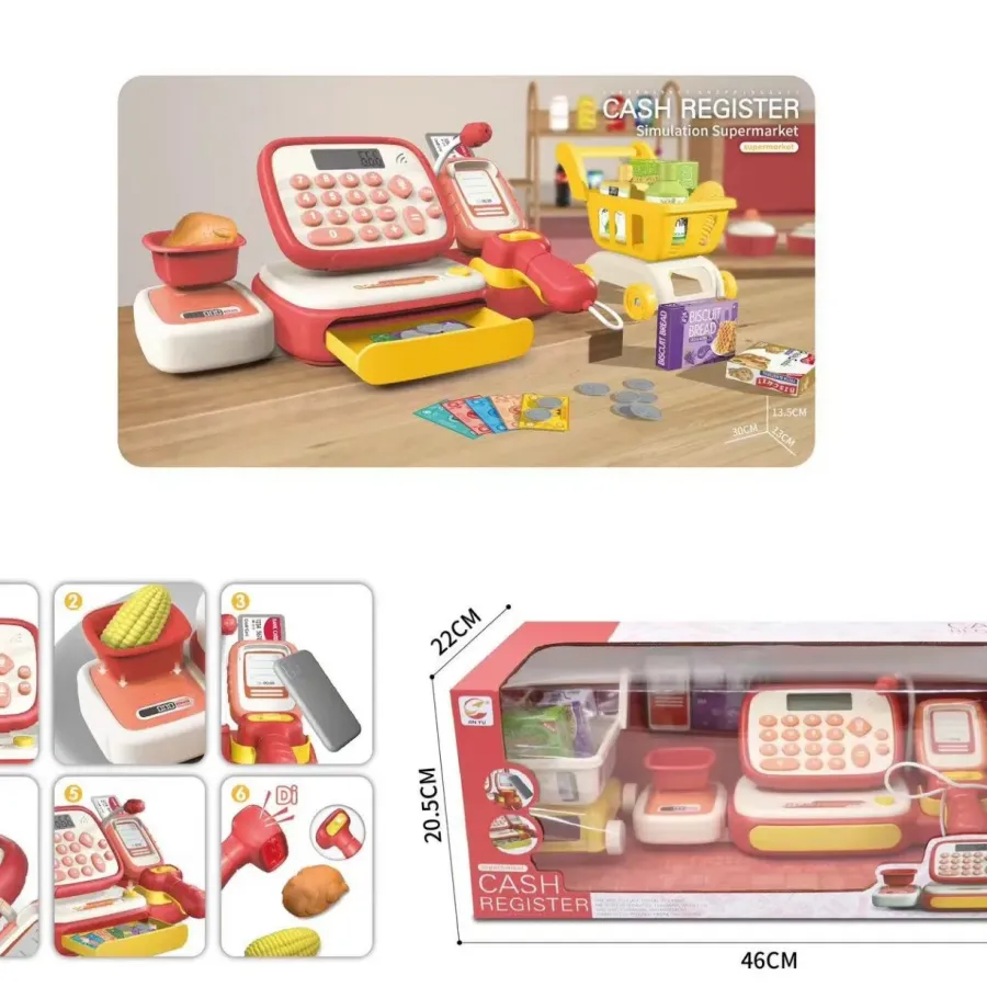 Касовия апарат е с баркод четец, четец на карти, калкулатор с цифров дисплей, монети и банкноти, различни продукти, микрофон, малко кантарче, черна лента за маркиране на продуктите.
