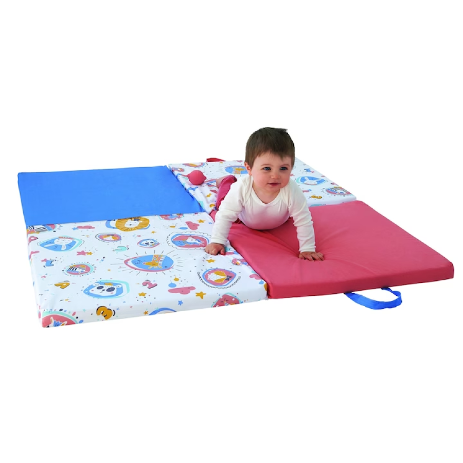 В напълно разгънато положение постелката осигурява безопасно и удобно пространство за игра. Меката повърхност предпазва бебето по време на движение, обръщане и пълзене.