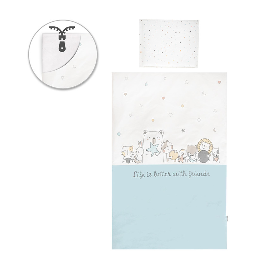 Дизайнът Happy Friends в синя цветова гама създава усещане за спокойствие и сигурност. Илюстрациите са меки, ненатрапчиви и подходящи както за момченца, така и за неутрално обзаведени детски стаи. Синият цвят допринася за релаксираща атмосфера, която подпомага по-лесното заспиване.