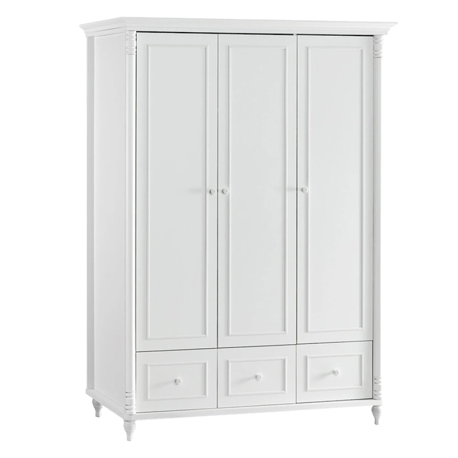 Трикрилен детски гардероб с чекмеджета Nil бял е перфектното съчетание от функционалност, удобство и модерен дизайн. Изберете надеждно решение, което ще осигури ред, организация и стил във всяка детска стая.