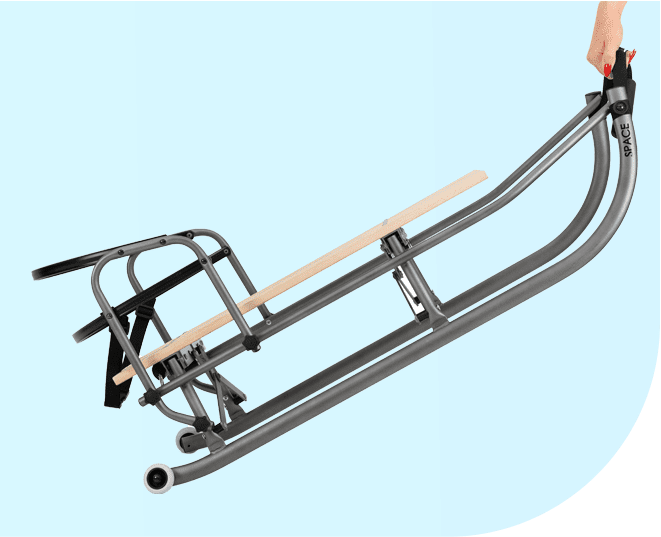 Леката и компактна сгъваема шейна SPACE, благодарение на механизма за сгъване, се сгъва за няколко секунди, прибира се лесно и не заема много място.