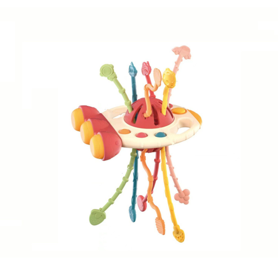 Формата на летяща чиния (UFO) предизвиква интерес и въображение у детето, докато ярките цветове ангажират вниманието му и го насърчават да изследва. При издърпване на въженцата, играчката създава различни вибрации и звуци, което прави преживяването още по-забавно и интерактивно. Тази динамична обратна връзка подтиква детето да продължава да експериментира и открива нови усещания.
