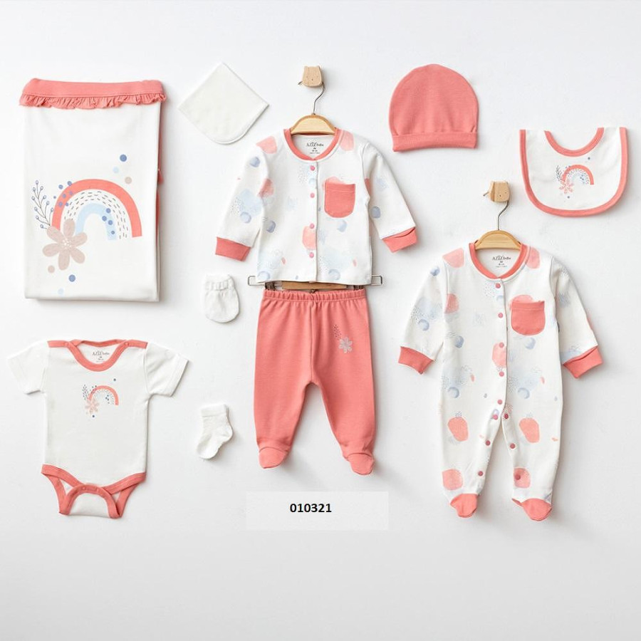Комплектът за изписване от 10 части с Розова дъга е перфектното решение за първите дни на вашето бебе. Включва всички основни дрешки и аксесоари, необходими за удобство и комфорт, създавайки стилна и практична визия.