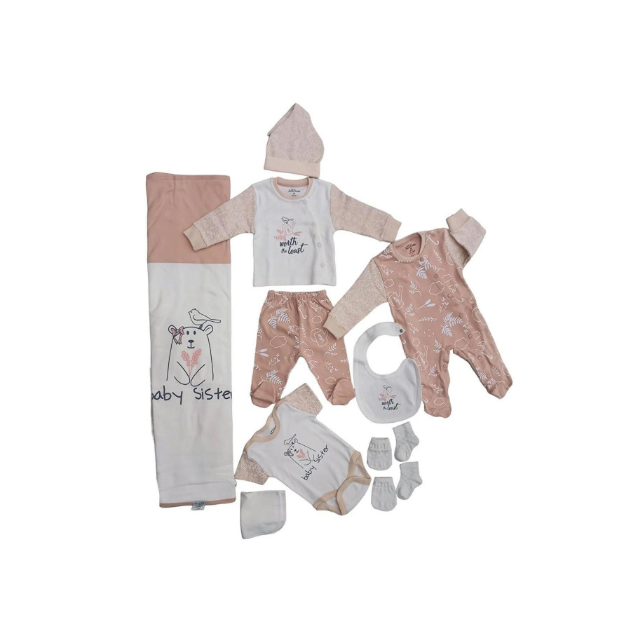 Комплектът за изписване от 10 части с Розово мече Baby Sister е перфектното решение за първите дни на вашето бебе. Включва всички основни дрешки и аксесоари, необходими за удобство и комфорт, създавайки стилна и практична визия.