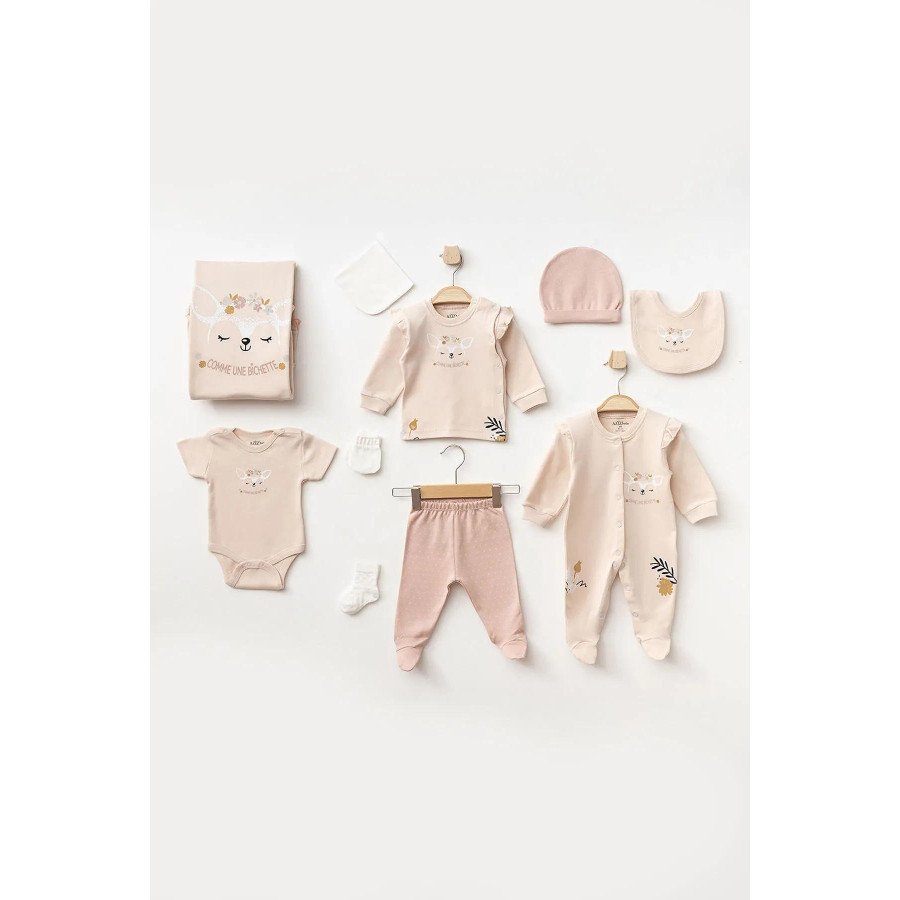 Този комплект от 10 части включва всичко необходимо за специалната и нежна облека на новороденото ви, размерът му позволява да се използва от раждането до тримесечната възраст. Всяка част от комплекта е внимателно изработена от висококачествени материали, гарантиращи мекота и удобство за кожата на бебето ви.