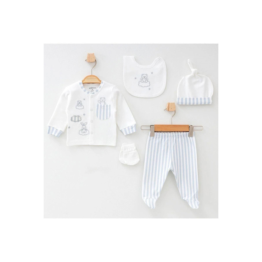 Търсите първите дрешки за вашето новородено? Комплектът за изписване от 5 части – Мечо и зайо е практично и стилно решение, което осигурява мекота, комфорт и защита още от първия ден. Изработен от 100% висококачествен памук, този комплект е подходящ за чувствителната бебешка кожа.