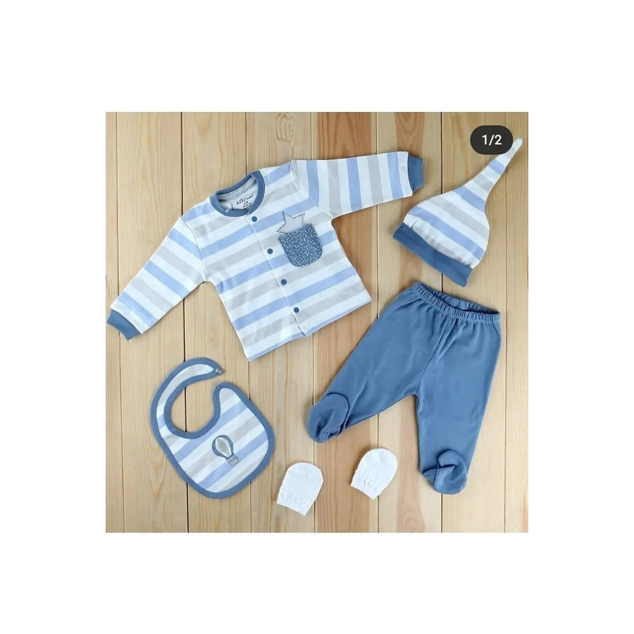 Търсите първите дрешки за вашето новородено? Комплектът за изписване от 5 части – синя гама е практично и стилно решение, което осигурява мекота, комфорт и защита още от първия ден. Изработен от 100% висококачествен памук, този комплект е подходящ за чувствителната бебешка кожа.