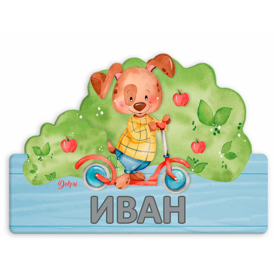 Красива детска декорация за детска стая с пъстър детски дизайн КУЧЕ - персонална табела от дърво, на която може да изпишете ИМЕТО НА ВАШЕТО ДЕТЕ и да я залепите, където си пожелаете. (на вратато, над леглото и др..) Продуктите са ръчна изработка, боядисани с нетоксични бои на водна основа.
