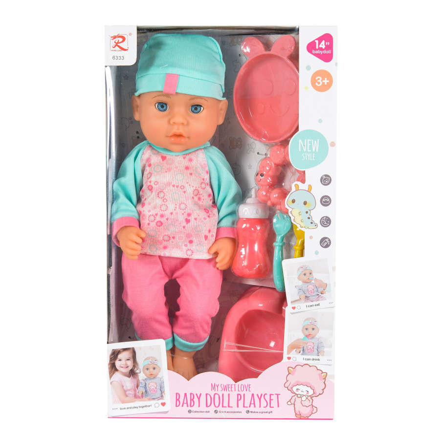 Открийте света на въображаемата грижа с кукла 36 см с аксесоари, която включва шише, чиния, прибори, гърне и дрънкалка. Тази реалистична кукла вдъхновява детското въображение и насърчава ролевите игри.