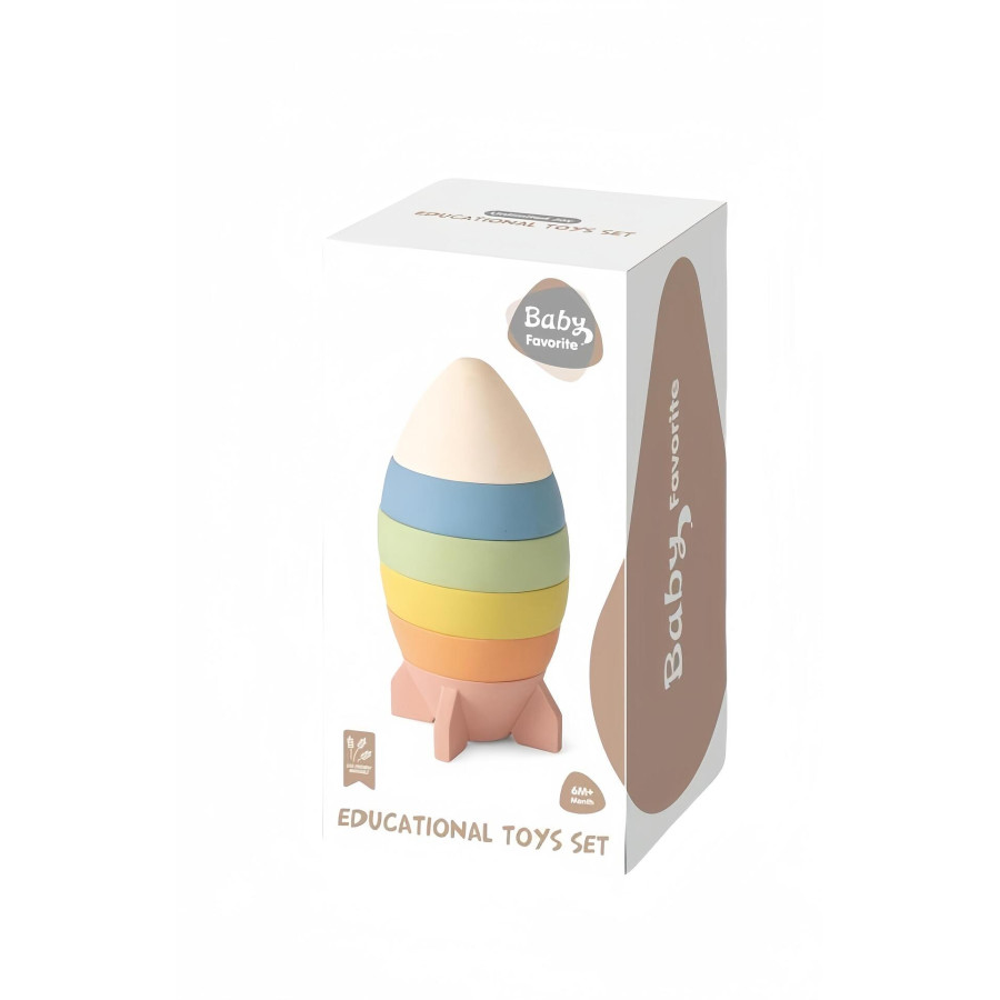 - **Елегантен дизайн**: Комплектът включва цветна пирамидка във формата на ракета, която ще привлече вниманието на всяко дете. Частите са в нежни пастелни цветове, които стимулират визуалното възприятие.