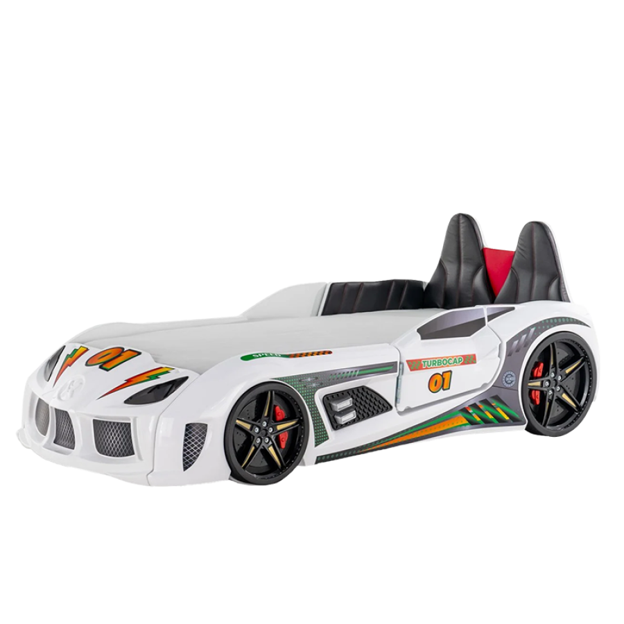 Детско легло TURBO CAP 90 x 190 - бяло впечатлява със съвършен баланс между спортна визия и елегантен, неутрален стил. Подходящо за истински малки почитатели на автомобилите, то предлага не само ефектен външен вид, но и множество функционални екстри. Изработено е от висококачествени материали, които гарантират здравина и безопасност. Моделът е оборудван с вградени LED светлини в колелата, а фаровете могат да се използват и като нощна лампа. Има 4 звукови ефекта, които се управляват с дистанционно, а електронните функции работят с 12V DC / 2A адаптер. Уникалните акценти включват тапицирана кожена облегалка на седалката и отварящи се врати – за още по-реалистично автомобилно изживяване. Стабилната конструкция издържа до 130 кг натоварване, а заоблените ръбове осигуряват максимална безопасност по време на сън и игра. Подматрачната рамка е включена в цената. Пълна информация за размерите и характеристиките на модела ще намерите в таблицата в таб/поле "Техническа информация".