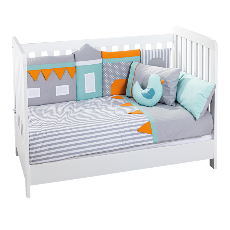 Декорацията на комплекта Bird House е вдъхновена от природата и детското въображение. Основният акцент са нежните къщички за птички, които украсяват страничния предпазител – символ на уют и топлина. Цветовата палитра комбинира сребристосиво, ментовозелено и оранжево, съчетани с фини сиви линии и точки от Wella плат. Тези меки, пастелни тонове създават усещане за спокойствие и хармония, идеални за сън и релаксация.
