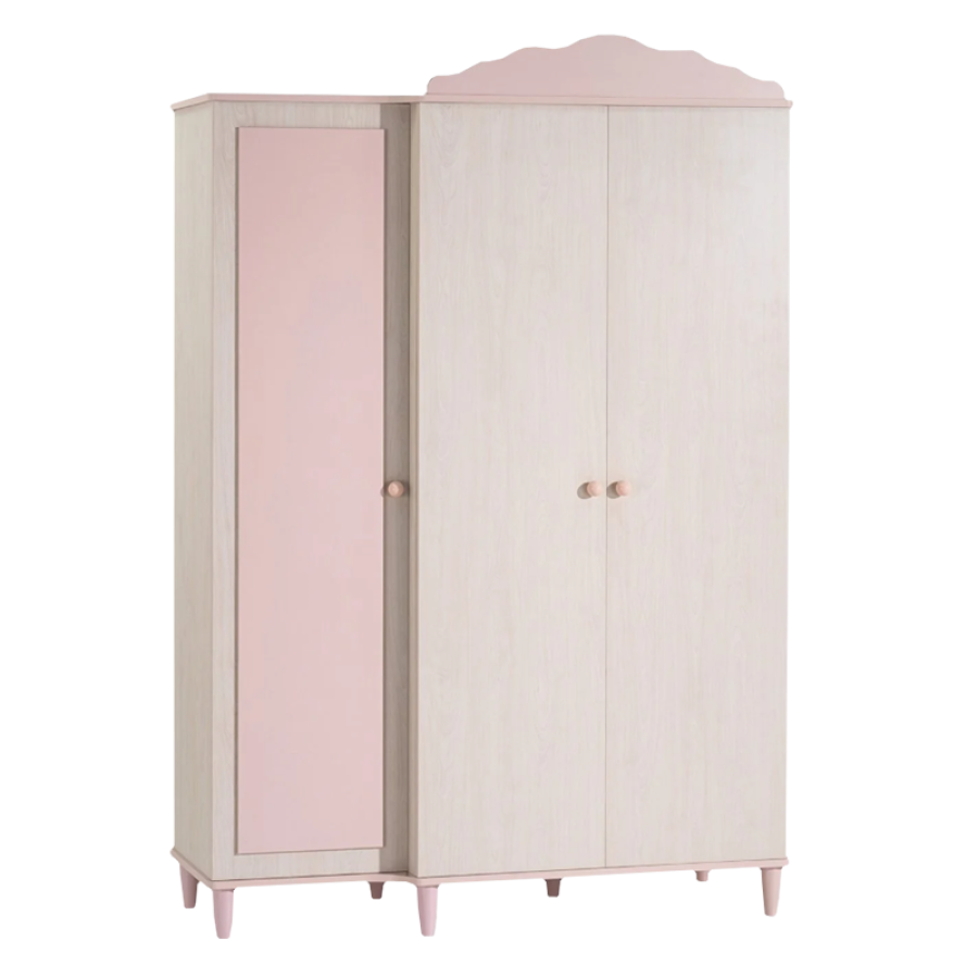 Трикрилният гардероб Pollina съчетава елегантен дизайн с практични решения за съхранение, правейки го идеално допълнение към всяка детска стая. Със своите 3 врати, модулна конструкция и комбинация от мек розов акцент и светла дървесна текстура, той създава хармонична и уютна атмосфера.