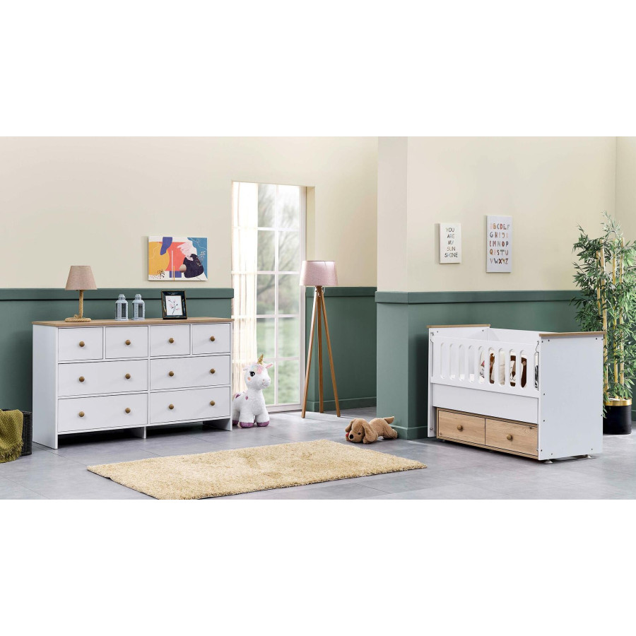 - Функционално бебешко креватче с чекмеджета – осигурява безопасност и удобство, с практично пространство за спално бельо, дрешки и аксесоари.