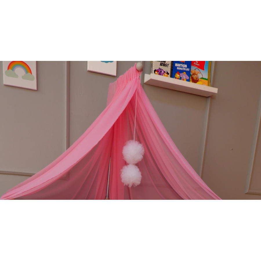 Подарете на вашето бебе уют и сигурност с нашия луксозен балдахин със стойка. Изработен от висококачествени материали, този балдахин съчетава стилен дизайн и функционалност. Елегантната бяла мрежа с розови кантове осигурява нежна защита от светлина и насекоми, създавайки спокойна и защитена атмосфера за сън.