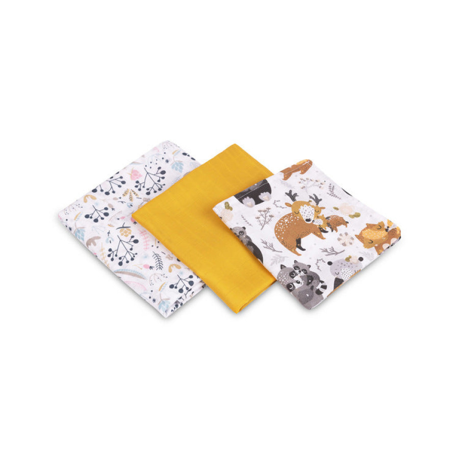 Комплектът включва три размера – 120×120 см, 60×80 см и 38×38 см – за различни нужди през деня: повиване, кърмене, подсушаване или покриване. Памучният муселин е изключително мек и нежен към чувствителната бебешка кожа, осигурявайки максимален комфорт и висока попивателност.